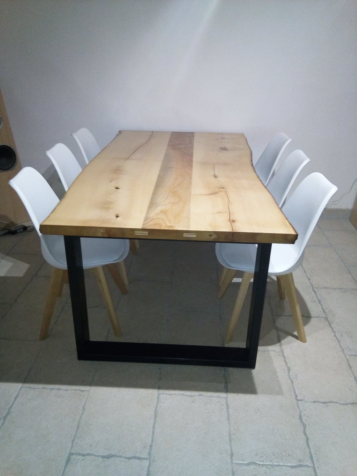 Fabrication d'un plateau de table de salle à manger en frêne avec bord en écorce.